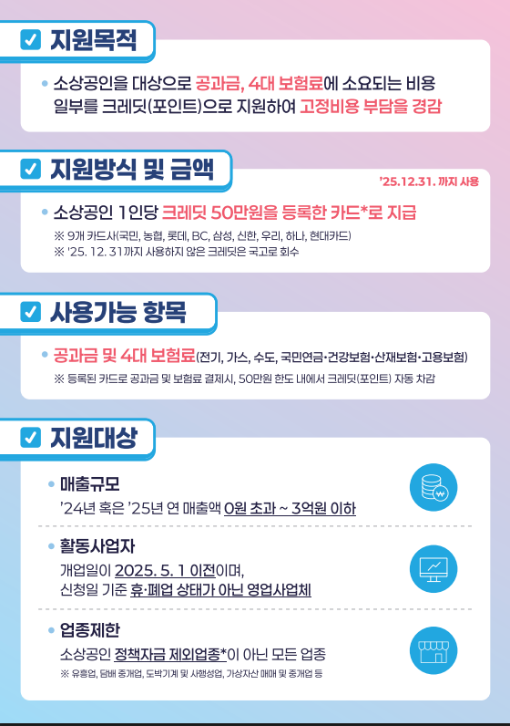 소상공인 부담경감 크레딧은 ‘일정 기준을 충족하는 소상공인’을 대상으로 지원됩니다. 주로 다음과 같은 조건에 해당하는 소상공인들이 지원대상이 됩니다.