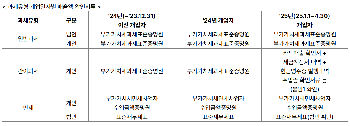 다만, 국세청에 매출 신고를 하지 않은 '25년 개업 소상공인 또는 법인 면세사업자는 아래의 요건에 따라 서류 제출이 필요합니다.