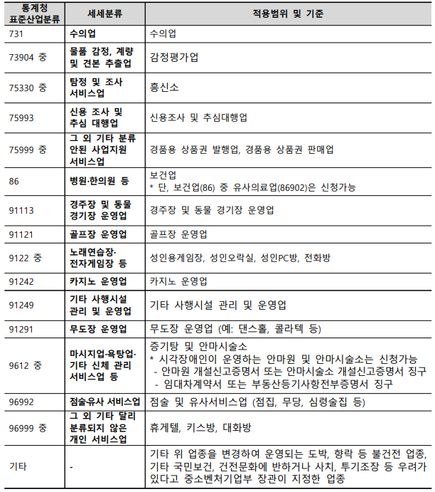 유흥, 사행성업 등 정책자금 제외업종이 아닌 경우 지원 대상에 포함됩니다. 자세한 내용은 아래 사진 참고하세요.