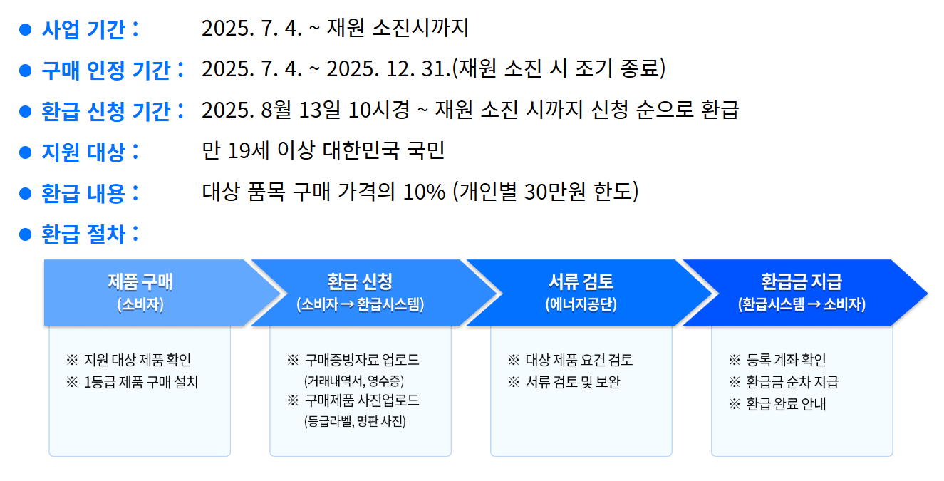 환급 대상 제품은 반드시 ‘1등급’ 또는 ‘으뜸효율’ 인증 제품이어야 하며, 적용 기준일을 충족한 경우만 인정됩니다.